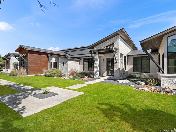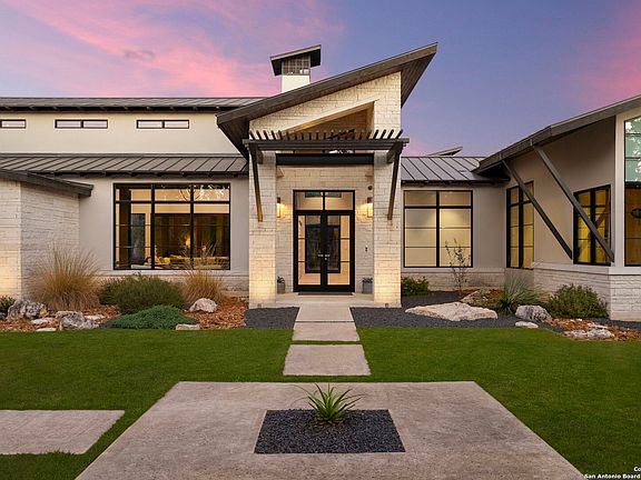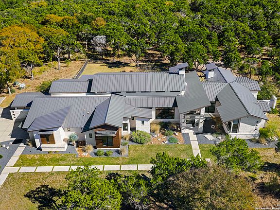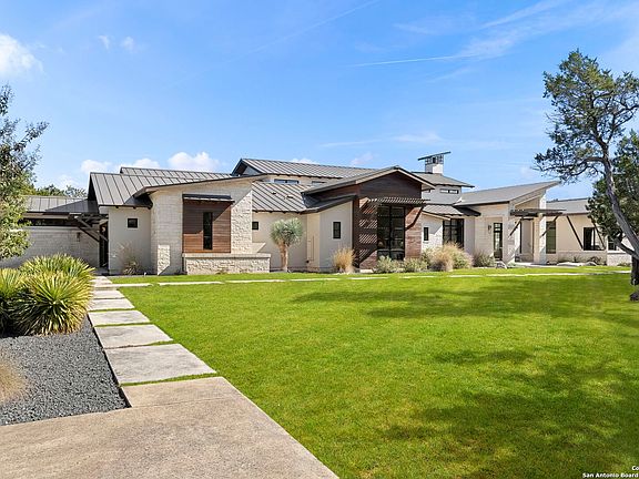 This exceptional estate presents a sophisticated, Todd Glowka single-story custom home, gracefully situated on 13.38 private acres within the Sendero Ridge enclave of Cordillera Ranch. As you pass through the private gated entry, the natural beauty and timeless allure of this property will immediately captivate you. A seamless fusion of Hill Country charm and contemporary design elements, along with a rich mix of materials and textures, has resulted in an architectural masterpiece. For those who love to entertain, this home offers boundless opportunities. Expansive walls of wood-clad windows, transoms, and glass doors frame breathtaking views of the surrounding landscape, while infusing every room with natural light. From the soaring ceilings to the grand stone walls, beautiful hardwood flooring, high-end designer chandeliers, ornate sconces, unique custom cabinetry, and steel columns-no detail has been overlooked. Each room is thoughtfully designed with architectural details that add depth and character, creating a sense of individuality throughout the home. The sprawling floor plan features a majestic great room with a cathedral ceiling and exposed beams, a striking floor-to-ceiling stone wall with a linear fireplace, and an expansive dining area perfect for large gatherings. For the culinary enthusiast, the gourmet kitchen is a true highlight. The island kitchen is meticulously designed with top-tier finishes, featuring a Wolf 6-burner gas range with a griddle and double ovens, complemented by a sleek vent-a-hood. Custom soft-close cabinetry, a wealth of counter space, intricately designed backsplashes, and premium appliances, including a side-by-side Sub-Zero refrigerator and freezer, a built-in Wolf oven, and dual sinks with disposals. The game room, designed for both elaborate entertaining and relaxed living, is equally impressive. With its suspended ceiling treatment and a full-service bar, this space exudes luxury and style. The bar itself showcases a wall of exquisite Poly-Lac cabinetry, creating a true architectural feature. Additional touches include an expansive island with bar seating, a Marvel ice maker, a beverage cooler, and doors that lead directly to the outdoor kitchen and living areas. Adjacent to the game room, the climate controlled wine cellar demands attention. With sleek glass walls that serve as an artful display, this sophisticated wine room is designed to showcase your finest collection. Featuring custom wine racking, accent walls with subtle lighting, and a wine probe, it's as much a visual experience as it is functional. The refined study is equipped with attractive wood and glass sliding doors and a wall of custom-built-in shelves and cabinetry. The owner's wing serves as a serene retreat, offering peaceful views and a tranquil environment. The luxurious, spa-inspired bath features floating vanities, designer sconces and chandeliers, a freestanding Jacuzzi garden tub with an accent wall, and a glass-enclosed shower that overlooks a private Zen rock garden. The two expansive wardrobe rooms within the owner's suite are outfitted with custom shelves, drawers, and hanging rods, offering ample storage space and a refined, organized feel. Three additional bedrooms each feature en-suite bathrooms, custom walk-in closets and automatic shades. The home also includes a well-appointed utility room and mudroom. Designed for year-round enjoyment, the expansive covered patio beckons with its inviting fireplace and multiple seating areas for dining, living, and lounging. This outdoor oasis offers endless possibilities, from hosting grand gatherings in picturesque Hill Country setting to enjoying a quiet morning while sipping coffee. The sparkling pool with an adjoining spa, lounging deck, and a soothing water feature creates the perfect space to unwind and enjoy the beauty of the landscape. Come experience the dream of living amidst one of Texas' most beautiful settings.