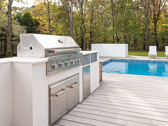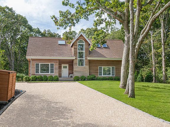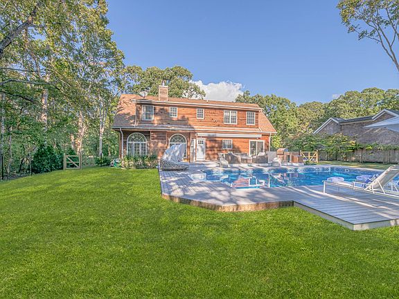 Welcome to 116 Spring Pond Lane, a 3-bedroom 2.5 bath home which has been fully renovated and professionally decorated. The welcoming style that has been created inside and out of this 2,000 +/- sq foot postmodern is evident from the moment you drive up the driveway. Located in peaceful Spring Pond Fairways offering community tennis and a private cul-de-sac setting close to the Peconic Bay, world renown golf courses and Southampton Village. The large bright sunken living room with 10'ceilings is the show-stopper! A gas fireplace with a custom light grey marble mantel, dry bar with marble countertop, Sub-Zero beverage fridge and Scotsman ice maker as well as library bookshelves compliment Phillip Jeffries wallpaper and custom blackout draperies. The beautiful white kitchen offers a statuary waterfall marble island, a statuary marble slab backsplash and white quartz countertops. Sub-Zero, Viking and Décor appliances include a wine refrigerator, refrigerator/freezer, freezer drawers, full refrigerator, microwave drawer, double wall oven and induction cook top. High ceilings, a dining area wrapped in windows, English details with chicken wire and marble shelves, satin nickel lock sets for all doors and an elegant detail complete this inviting space which also has access out to the maintenance free decking, heated salt-water pool and extra-large hot tub with a stainless-steel interior. The cozy office /potential 4th bedroom has a custom beam ceiling and French doors along with custom drapery for privacy. A convenient powder room/pool bath with marble floors, custom vanity, marble sink and towel niche is accessible from the outside where you will find an Azek robe wall with ship lap details. A postmodern tall window draped in Holly Hunt sheers and a custom carpet runner greet you as you make your way to the upstairs. The large primary bedroom is glamourous and elegant. It's marble and quartzite bathroom includes a vanity, towel niche, magnify makeup mirror, polished chrome hardware and barn slider shower doors. Two other bedrooms share a chic hall bath complete with tub shower, towel niche and a vanity with a quartz mitered countertop. The doors on this floor have been leather wrapped giving this area a truly transitional vibe. The lower level has matching hardwood with that of the main parts of the home. A Rec area is complete with an egress window and additional framed square footage to add a full bath. Custom mirrored French doors lead to a new laundry room and extra-large storage room. You will be equally as wowed by the outside as you are by the inside: In addition to the deck, pool and hot tub, the back yard offers supreme privacy backing up to large common area space. A custom 14' retractable automated awning, white Lapitec dining table with seating for 10, built in 16' BBQ with white stone counter & built-in cedar herb planter and Azek privacy wall for the pool equipment all add to the ambiance of this fun outdoor space. There is ample yard remaining for gardens, hammocks and playing. Additionally, a new pea gravel driveway with Belgium block apron has just been completed. Boxwoods, large evergreens and lavender have been planted. A new fence and gates have been installed around the property. Many Chandeliers, sconces and pendants have been added along with recessed square high hats for mood lighting. Custom closets have been built and Samsung TVs mounted. This house is truly a find in today's market. Grab it while you can!
