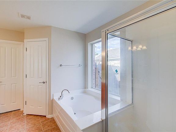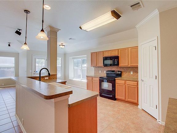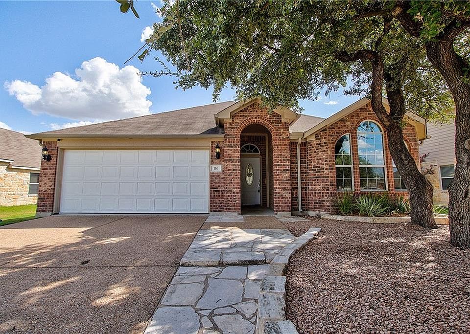 This Leander one-story home offers a deck, a wood-burning fireplace, a breakfast bar, and a two-car garage.