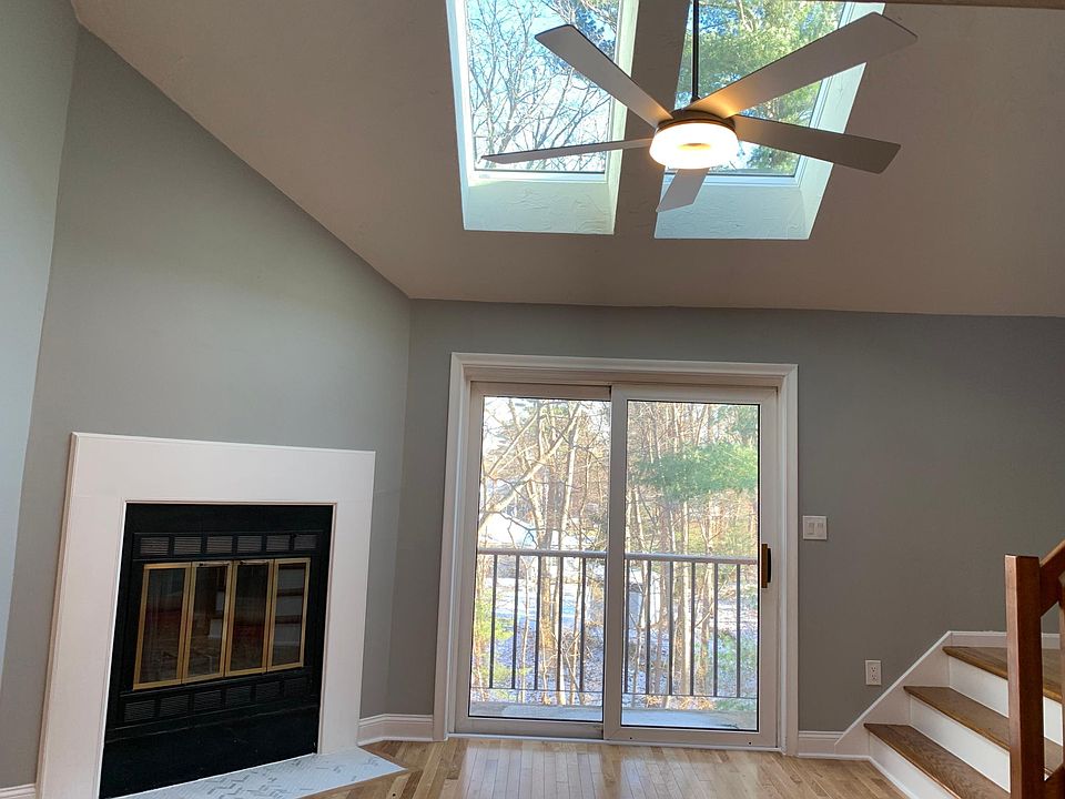 Cozy fireplaceCentral airHardwood oak floorsUpdated gorgeous lighting fixturesIn-unit washer and dryerHigh ceilings with skylights
