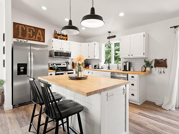 Modern butcher block countertopsFresh paintNew flooringLarge islandStainless steel appliancesFreestanding gas stove