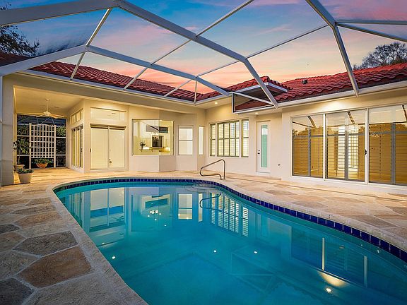 The vast outdoor space, highlighted by a beautiful pool, newly resurfaced patio, & oversized screened lanai, is a true retreat & creates the perfect backdrop for entertaining or simply relaxing & taking in the surrounding nature. The recently installed premium drainage system is truly second to none. And, Brand New Outdoor LED Lighting, combined with pristinely manicured landscaping, mature palms, and flowering hedges, adds to the serene ambiance.
