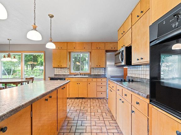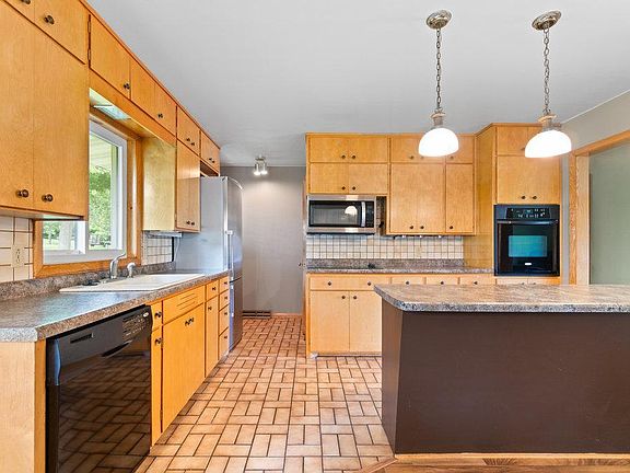 Larger than it looks with main level fireplace in kitchen dinette/family area with separate rec room with sliding doors to the rear yard area. Large yard with low traffic street with lots of yard space and landscaped for sitting areas and play areas. Main level bath has laundry area with secondary laundry possible in lower level. Lower level with two bonus rooms used for bedrooms with full bath and large rec room. Egress window in lower level utility room but not in finished rooms. Many updates with windows, siding, doors, mechanicals, bsmt finish, & appliances. Main level bath with tub & separate shower stall, edge of town quiet location, nicely sloped yard for ease of mowing and grilling/;picnic patio in the rear yard.