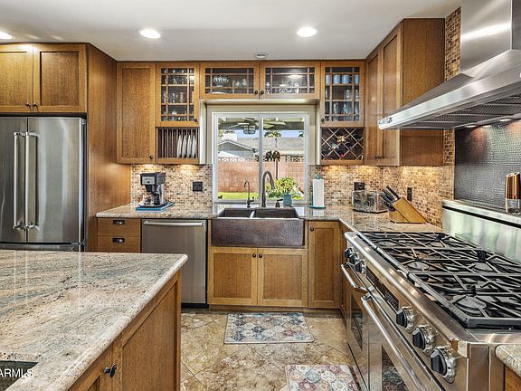 Beautiful home located on a quiet street near Moon Valley Country Club! Offering an open floorplan with elegant travertine flooring, Canterra stone fireplace and abundant natural light through the dual-pane windows. The remodeled kitchen features a premium 48'' Dacor six-burner gas range with custom cabinetry, granite countertops, two copper sinks & huge walk-in pantry. Hall bath has been completely updated with a deep soaking tub/shower. Spacious primary suite with a remodeled shower and space to expand bathroom. Outside, enjoy a diving-depth saltwater pool, raised garden bed & mature citrus trees. 220 sq ft storage room could be a 4th bedroom or office. New HVAC system (2024), tankless water heater (2015) & 50-year metal roof (2010), ensure efficiency and peace of mind for years to come