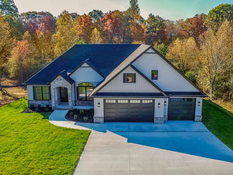 Step inside to relish the abundance of warm natural light highlighting the exquisite white oak hardwood flooring throughout. The custom windows in the home are double paned, 3/4' gas insulated and are remarkably quiet and energy efficient. Soaring ceilings, elevated accent wall details, and modern molding throughout. The Great Room showcases a floor to ceiling stone fireplace design with wood shelving, built-ins. Sophisticated kitchen design adorned with black & white color palette is crisp and timeless. Modern features, luxurious granite countertops, with a waterfall island that boasts a sleek 'dark stainless' farm house sink. The spacious owner's suite is a sanctuary of relaxation.Luxurious custom black and white soaking tub, marbled tile, walk-in glass shower, oversized custom closet with a window, and convenient outlet for ironing station. Two additional spacious bedrooms, guest bath, laundry room and huge pantry complete this favorite floorplan. Outdoors, enjoy the large screened-in retreat and large patio for grilling, perfect for peaceful mornings or evening gatherings.