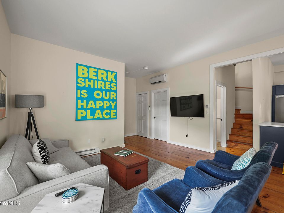 Sunny, in-town townhome on Great Barrington's sought-after Hill—walkable, low-maintenance, and move-in ready. This 2-bed/2.5-bath, ~1,425± sq ft end unit lives large with an open first floor featuring a renovated kitchen (c. 2022) with island and newer stainless appliances, convenient in-unit laundry room, and half bath. Upstairs, two comfortable bedrooms each offer an ensuite bathroom and great closet space for easy everyday living. A private, fenced patio garden extends your living outdoors, and there's ample off-street parking. Efficient mini-splits (installed ~2021; serviced annually) keep things comfortable year-round. Association handles the heavy lifting—ideal for a Berkshire base you can lock and leave.