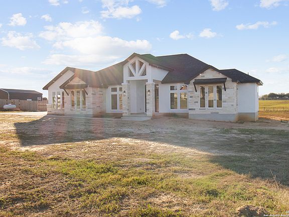 Built by Plata Custom Homes,LLC. This Elegant Hill Country-style custom home featuring exceptional craftsmanship and stunning sunset views from the backyard. Located in a charming small-community neighborhood with quick access to Loop 1604, this home offers the perfect blend of peaceful living and everyday convenience. With nearly 2,900 sq ft, 4 bedrooms, 3.5 bathrooms, and a dedicated study, this thoughtfully designed layout places the private primary suite on one side of the home and the secondary bedrooms on the other, providing comfort and privacy for everyone. As you enter, you're welcomed by soaring ceilings and a spacious entryway. The home includes a beautiful study accented with glass statement doors and a private dining room-ideal for hosting holidays and gatherings. The kitchen showcases a large quartz island, clean white finishes, and a clear view of the breathtaking sunsets through the back windows. The living room features a cozy fireplace with custom built-ins for added charm. The primary suite offers a tray-ceiling detail, an oversized walk-in shower, and a spacious closet with custom shelving.Ready for move-in. The laundry room includes a sink, custom wood cabinetry, and quartz countertops that continue throughout the home. Additional features include a fully insulated garage and a pre-wired security system. The covered back patio-with a ceiling fan and fireplace-creates the perfect setting for enjoying Texas BBQ and Hill Country views. The spacious backyard offers ample room to design your dream outdoor oasis. Builder warranty from 2-10 Home Warranty provided.