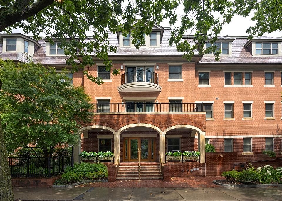 Enter through the double doors into a spacious foyer and living area featuring custom millwork, gleaming floors, and a gas fireplace. Enjoy the view from the balcony that overlooks a wall of greenery. Cabinets and counters galore grace the separate kitchen with its island sitting area. The condominium's placement within the building is ideally suited for privacy and tranquility. Step outside the front door of 1160 Beacon, an elevator and concierge building, to experience the vibrant atmosphere of Brookline's Lower Beacon Street, and then retreat to the peaceful serenity of Amory Park just around the corner. Recent building projects adding heat pumps, a white roof, additional insulation, and solar panels provide energy improvements and efficiencies that meet or exceed the most current standards. Access two private storage areas, one within the unit and the other directly behind your deeded garage parking space. A Gem!