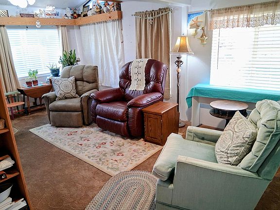 This spacious furnished park model 2 bedroom, 1.5 bathroom home, with new metal roof, 2-car carport, covered front deck and large covered back deck with view is move-in ready in desirable Winter Haven Park with pool, jacuzzi, clubhouse, exercise room, and many activities. Master bedroom includes adjustable queen-sized bed. Vaulted ceilings with view. Kitchen includes side-by-side fridge, ceramic cooktop stove and above-stove microwave combo and dishwasher! Bathtub/shower equipped with a grab rail. The laundry room/half bath includes full-sized smart HE washer and dryer, linen closet, cupboards, and long counter. All appliances stay. 12 ft by 8 ft wired workshop/shed. Close to central mailboxes, gazebo with picnic table, and beautiful desert landscaped walking pathway. Buyer to verify all information.