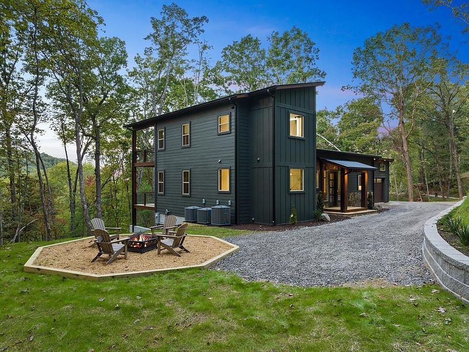 Stunning Mountain Modern with Year-Round Views! Thoughtfully designed new construction offering four bedrooms, four and a half baths, and a rare attached two-car garage, all tucked behind a long private driveway for added privacy. Open-concept layout showcases vaulted ceilings, dramatic double-sided fireplace, and expansive sliding glass doors that frame sweeping mountain vistas. Primary on main and The spa-like primary ensuite and main-level laundry provide everyday ease and comfort. The terrace level is perfect for entertaining, featuring an oversized great room with a stylish wet bar and a second laundry room for added convenience. Outdoor living is just as impressive, with a spacious firepit area, private lot with plenty of usable land, and panoramic views that make every gathering unforgettable. Ideally located just minutes from downtown Blue Ridge, you'll enjoy boutique shopping, fine dining, hiking trails, and the beauty of Lake Blue Ridge, all with easy year-round access. Whether you're searching for a full-time residence, a weekend getaway, or a potential high-income producing short-term rental, this modern mountain retreat offers the perfect blend of luxury, comfort, and lifestyle.