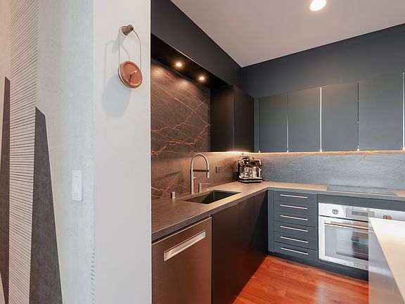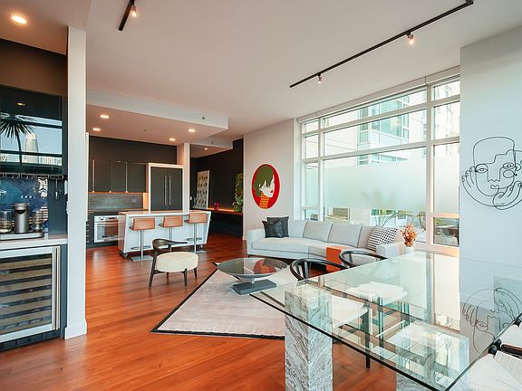 True floor-to-ceiling windows flood the condo with sunlight, while you soak in views of the SF skyline. The home is nicely appointed with 11' ceilings, teak floors throughout, Bosch kitchen appliances, Studio Becker cabinetry, high-end countertops, gallery lighting, and a breakfast bar.