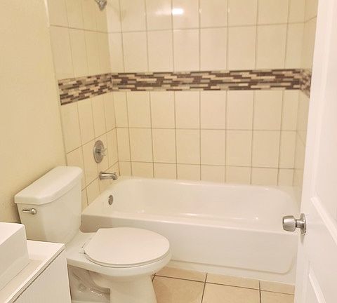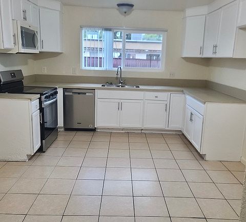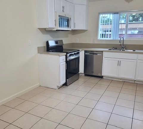 Freshly updated ground floor 3-bed/2-bath with tile flooring, newly remodeled kitchen, designer tile in bathrooms, new blinds, fresh paint, updated appliances including dishwasher, microwave, and glass-top stove. Refrigerator/freezer isn't pictured, but yes it is included.