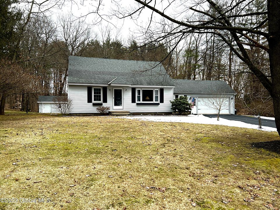 Located in Queensbury within a short distance to Lake George. Situated on just under 1 acre (.93), this cape cod style home has new Central heat and A/C in October 2022, new septic tank 2018, newer updated bathrooms, newer water heater, new kitchen appliances 2022, newer windows, newer siding, renovated 1st floor bathroom 2021, sealed driveway 2022. First floor bedroom and full bathroom, with WI closet and bonus room that could be bathroom, used as an office. Hardwoods floors, large bedrooms on 2nd floor, ample storage space throughout, separate dining area & 2 car garage. Private back yard with fenced in area, 2 apple trees, a pear tree and a patio paver sitting area. Bonus utility garage in back yard with additional overhang, power and wired for a generator.