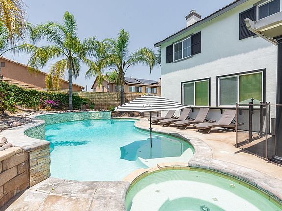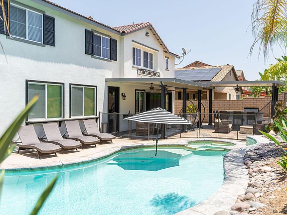 This exquisite family home was renovated by HGTV's very own Tarek El Moussa! The spa like primary bathroom boasting 6 shower heads in the walk-in shower is one of the many features that makes this space a premium one of a kind home. The primary bedroom features two incredibly spacious walk-in closets along with an attached private suite with a personal fire place and 75" smart TV. The backyard speaks for itself, offering an outdoor vacation like oasis featuring a sparkling salt water pool (heated upon request), in ground jacuzzi, built-in granite island BBQ with seating for 6, built in gas fire-pit, and 65" TV for ultimate outdoor entertainment. Inside, discover a tranquil primary suite as mentioned earlier with a cozy fireplace and spa-like bath, a fully equipped gym with a 4 person sauna, executive office with 3 desk for remote at home workers or home schooling the young ones, and a versatile playroom with games and a 35" smart TV. The spacious family room with a fireplace serves as the heart of the home. Designed with attention to detail, it promises joy, serenity, and memorable family moments in a welcoming community. The automatic door opening to garage can fit one mid-size vehicle comfortably and safely to enter the home dry on the rare rainy day. Newly renovated, painted (interior/exterior), and constantly upgraded with modern amenities and furnishings to make you always at home, this home will quickly feel like your house as intended. From the Nespresso coffee maker, to the waffle maker, your heart will feel at home. Pricing will vary depending on length of stay, advertised price is for three-month plus stay. Welcome to your new haven!