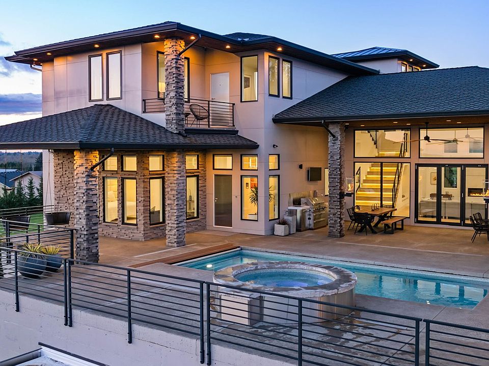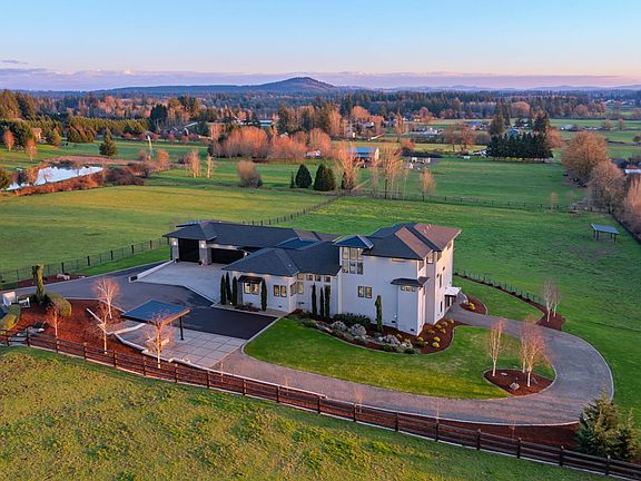 Experience contemporary luxury in this custom-built home where modern design meets exceptional craftsmanship. Set on 5.14 acres with territorial views, this meticulously maintained home offers quality that is next to none. The interior features 16-foot ceilings and white oak hardwood floors, while exterior windows include Jeld-Wen laminated glass and all exterior doors are Forced Entry doors from Italy, providing top-level security.The living and great room feature a 72-inch propane fireplace with a floating concrete hearth. Oversized doors open to an outdoor courtyard with a swimming pool and hot tub, seamlessly connecting indoor and outdoor spaces.The kitchen includes a six-burner propane cooktop, dual electric ovens, two dishwashers, a slide-out microwave, and a commercial-grade refrigerator. A butler’s pantry adds functionality and ample storage.The main floor hosts a private primary bedroom with an ensuite bath, a large dressing area, and a walk-in closet. The bathroom features two floating vanities with under-cabinet lighting, a soaking tub, and a shower with a U by Moen WiFi controller for up to five showerheads. A second primary suite is also on the main level.Upstairs, two bedrooms each have private ensuite bathrooms and are located near the second-floor laundry area.The lower level offers a family room, a sauna with Alaskan Yellow Cedar walls and benches, and a home bowling area for entertainment. The property includes a six-car garage for all your vehicles and toys, with no shortage of storage throughout the home.