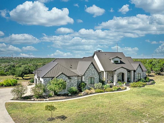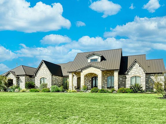 No HOA. Tax Rate - 1.55%. Welcome to your Hill Country sanctuary - a place where modern elegance meets peaceful Texas living. Tucked away on 5.34 acres, this 4-bedroom, 5-bathroom estate offers the perfect balance of luxury, privacy, and comfort. Built in 2016, this custom 3,994 sq. ft. home was thoughtfully designed with exquisite details and timeless craftsmanship. Wide-plank rare hardwood floors and 14-foot ceilings with exposed beams set the stage for bright, open spaces filled with natural light and warmth. The chef’s kitchen is a masterpiece in both form and function - generously sized with top-of-the-line appliances and a 10-foot island perfect for gathering and entertaining. In the heart of the living space, a gas fireplace framed by a live-edge wood mantel offers an inviting atmosphere for relaxing evenings at home. Two serene primary suites offer private retreats, each with spa-inspired bathrooms and custom closets. The main suite opens directly to the patio, where mornings begin with Hill Country views and quiet coffee moments. Upstairs, a versatile 400 square foot flex space functions beautifully as a guest suite, playroom, or media room, complete with a full bath and storage. Step outside and experience the resort-style living - an expansive covered patio with a fireplace, an outdoor kitchen, and a sparkling pool with waterfall and hot tub designed for year-round enjoyment. An outdoor bath adds comfort and convenience. A barn provides extra room for hobbies or storage, while the 3-car garage features a workbench and attic space. A mobile home manufactured in 2019 conveys with the property, offering an ideal space for guests, extra income or owner based business. Zoned to top-rated Baldwin Elementary, Gorzycki Middle, and Bowie High School, this estate blends the best of Hill Country tranquility with city convenience - where every day feels like a retreat, yet Austin’s vibrant life is just minutes away.