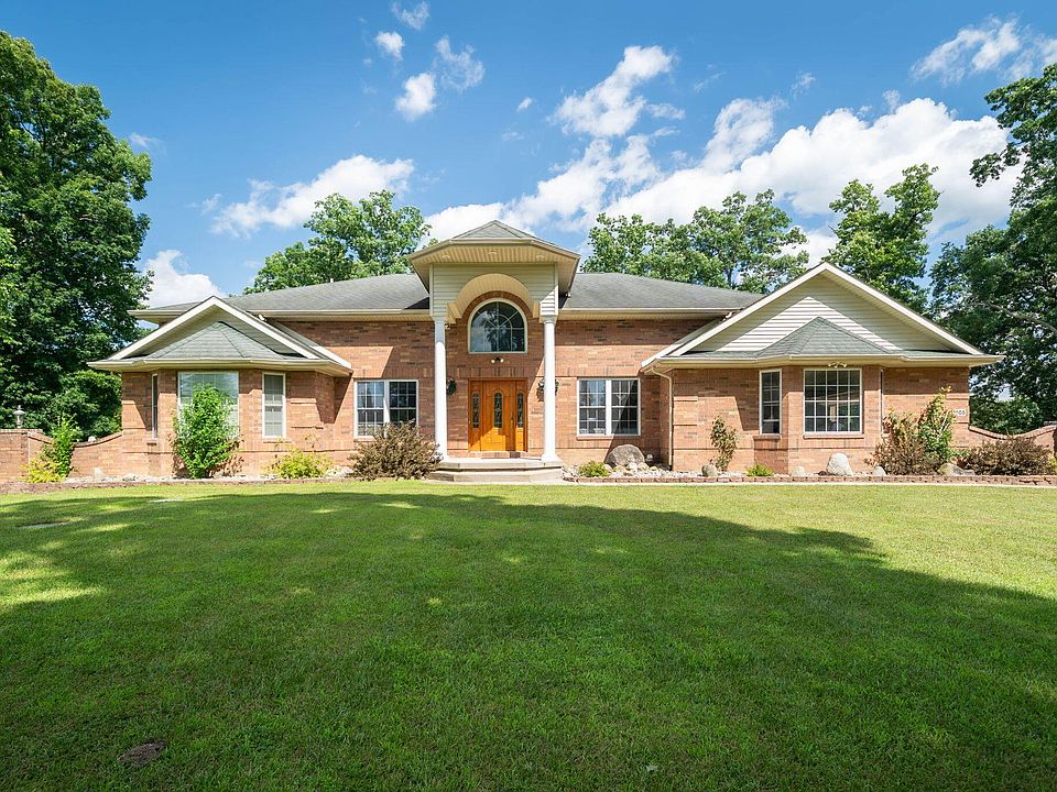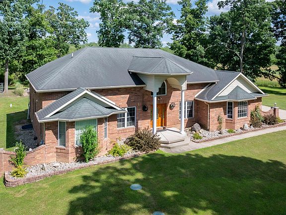 Napoleon the Chihuahua says: ''WOW! WOW! WOW!'' This custom-built brick home with a three stall garage, is wow through out! From the great room entry featuring vaulted ceilings and a wide grand oak staircase, pass through the arch way to the kitchen or the dining and living rooms. The master suite and a second bedroom connected to a full bath, complete the main floor. Upstairs, there are two bedrooms each with private bathrooms, and an office area. The finished basement has three bedrooms, and a full bath, rec room, office, and plenty of storage. Outside, there is a large 20' x 20' deck, a 32' x 48' pole barn, which will be finished, and 34 acres of land, which used to be a farm and a forest, to roam, hunt, and enjoy the wildlife.