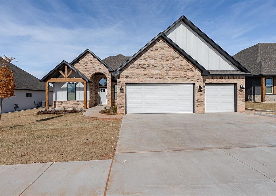 Amazing New Home, Custom built maple cabinets with 3cm quartz/granite throughout. Cathedral Ceiling in living room with custom beams, brick fireplace surround, Stainless steel whirlpool appliances, Study plus Optional 4th bed/Bonus room upstairs, 1/2 bath, Amazing Theater Rm, with surround sound, 75-inch Smart TV and built-in mini-refrigerator. Bluetooth speakers in Master bath. Master Bedroom with vaulted ceilings, double vanities, framed mirror surround, Whirlpool tub & walk-in shower. Designer paints with satin finish. Custom lighting packages with ceiling fans in all bedrooms, Brick exterior with oversized patio, Sprinkler system, Security system, STORM SHELTER in garage floor, Blinds, and more. Right across the street is Wild Horse Park where residents can enjoy the natural beauty of a 153 - acre park featuring a fishing pond, walking and bike trails, a community garden, and sports complexes including softball and baseball fields and soccer fields. Mustang Town Center across the street has access to workout rooms, basketball courts, swimming pool, library and senior center, offering an active lifestyle for residents of all ages.
