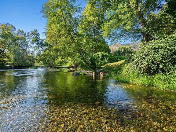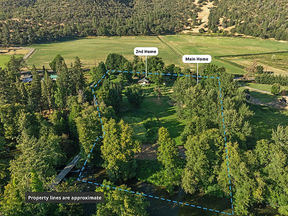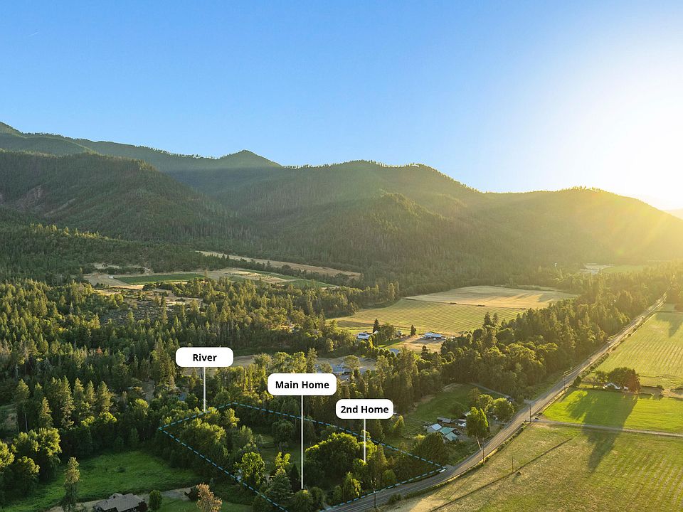 Set on 4.55± acres along the Applegate River, this park-like retreat features level lawns framed by mature trees, small pond, & +/-200 feet of river frontage - an inviting backdrop for gatherings, relaxation, & time on the water. Two legal homes, barn, & chicken coop blend lifestyle charm w/utility. The updated main home (~2,024 SF) comes fully furnished & offers a vaulted great room w/exposed beams, & newly remodeled kitchen w/large island, abundant counter space, & sleek, modern design. Three bedrooms & three baths are complemented by a versatile bonus sleeping/game room. Outdoor living is private w/a large deck, patio, & hot tub overlooking the lawns that stretch to the river. A detached two-car garage sits beside the home. The second home (~1,147 SF) features vaulted ceilings, an eat-in kitchen w/pantry & built-ins, two bedrooms, 1.5 baths (main w/separate soaking tub & shower), a two-car attached garage, & a covered deck. Minutes to Red Lily Vineyards & close to Jacksonville.