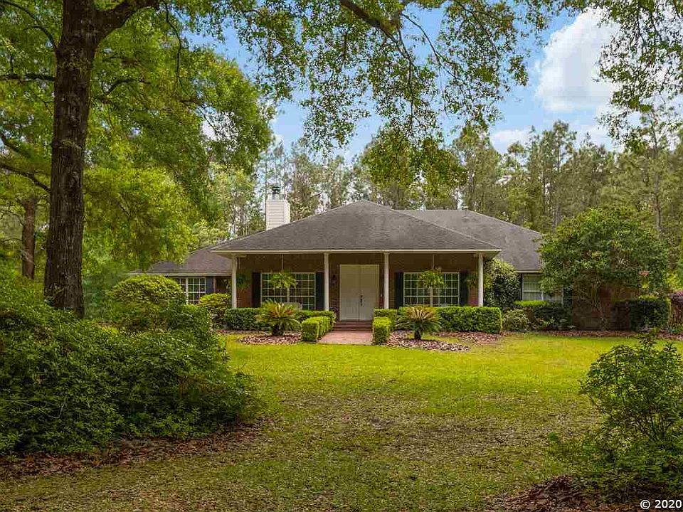 This beautiful and secluded all- brick home is located on over 5.5 acres and is accessed via a winding private drive through hardwood trees and luscious Florida landscaping. Custom built and beautifully maintained, the 4 BR 2.5 BA home has over 2550 square feet of living space is light and bright with high ceilings, an open floor plan and delightful upgrades. Walk up the front brick porch, through the double-door entry into the foyer, past the formal dining room with beautiful wainscoting, and into the large great room with brick-accented floor, fireplace and very nice built-ins. The remodeled kitchen has plenty of quartz counter-top space, stainless steel appliances, and opens to the great room, dining room and breakfast room. The Master bedroom suite has a spa- sized shower with a double sink vanity and oversized closet. The three auxiliary bedrooms are spacious; two feature window box seating. Most of the rooms in the home give a view of the private backyard area complete with pool, travertine decking, covered lanai and summer kitchen. Great location just minutes from UF Health, Shands and the University of Florida.