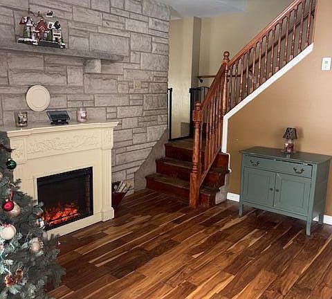 Modern kitchen with a large island, quartz countertops, modern baths with tile, fireplace in the large family room, balcony off the master bedroom and plenty of space. Located on a corner lot with off street parking and a fenced yard to reign in those human and fur babies. The lower level has a bedroom and the laundry with level outside access. Check out the low taxes!