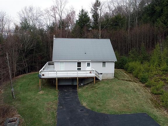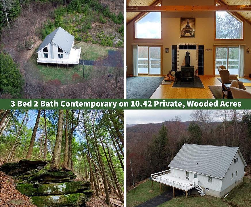 This contemporary 3 bed, 2 bath home, set on 10+ hillside acres with westerly views, features a cathedral ceiling design to allow copious amounts of light into the impeccably maintained, open concept living space. The home itself, built by the sellers in the early 90s, sits on a poured concrete foundation, and boasts an expansive wrap-around deck ideal for relaxing or entertaining in the Catskill air. Double Anderson sliding doors from the main living space provide for accessibility options and natural light. Enter the home from the deck entry, or the walk-out basement with single car garage door. The main floor of the home is the social hub of the space. The kitchen has ample counter and cabinet room, stainless steel appliances, gas range, and an island for food prep and informal eating. There is plenty of space for larger meals in the dining corner. A centrally located woodstove is perfectly placed to add a cheery glow and warm the space evenly. The house comes fully furnished, and the living room area is set up nicely for socialization and relaxtion. The main floor also contains a large full bathroom with tile flooring and tub surround, and two bedrooms - each with carpeted floors and ample closet space.Ascend the stairs to find a functional loft space which could be utilized as a gaming area, office, or reading/craft nook. The second floor has another bedroom with space for multiple beds, and a bathroom with shower stall.The basement has tall ceilings and is segmented into distinct spaces for vehicles/equipment, storage or workshop space, laundry and utilities, and has an area around the stairway that could be finished.The setting for the home is private and alluring; as you ascend the switchbacks on this town maintained road, potential valley views become evident, and the lot features a tidy lawn area and trails up into the hillside comprised of mixed hardwoods and spectacular rock features.The land itself is two tax parcels, running from the edge of Crystal Meadows Road, and up the hillside at a moderate slope. There are multiple established trails on the lot, and with a little refreshing of the trail network, it could be great for quad riding and hunting, or simply enjoying the serene atmosphere and natural features of the land. The home is located just minutes to Downsville and the Pepacton Reservoir with an abundance of recreational opportunities, and is just over 2 hours from the GWB.