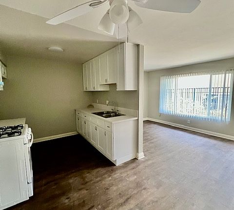 Spacious ground level 1- bedroom, 1- bathroom apartment home located in Downtown Long Beach Features include: Freshly painted two tone walls, vinly click flooring throughout, white shaker cabinets, quartz countertops, gas stove, ceiling fans in the kitchen and bedroom, new blinds, lots of cabinets and countertop space and plenty of windows that allow in natural light 1- car garage available for $100.00 monthly fee Laundry Room Onsite Rental Requirements: 620+ FICO score preferred Income must be 2.5x the rent No prior unlawful detainers 11 MONTH LEASE TERM