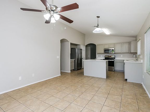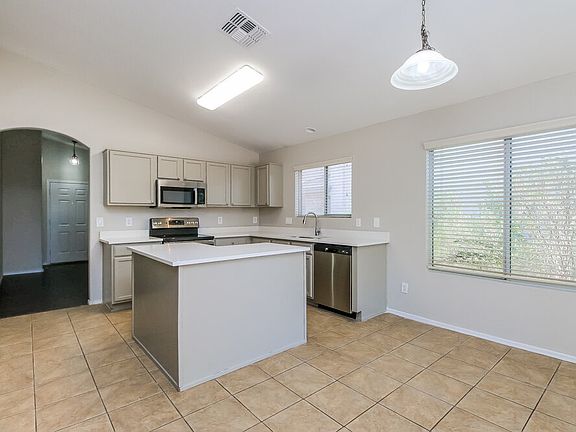 This renovated San Tan Valley, AZ rental home is a must-see. Find three bedrooms and two bathrooms, along with a private enclosed yard boasting several mature shade trees and a covered patio. Your tour begins in the family room, which features an angular ceiling for a comfortable breeze. Access the covered back patio via the sliding glass doors. The kitchen comes well-appointed with stainless steel appliances, a built-in microwave, a large island, and plenty of countertop space. You'll love the arched doorway leading into the living room. Down the hall, find the bedrooms and the laundry room. Features of the primary suite include wood-look flooring, dual closets, and an adjoining private bathroom. Contact us soon to schedule your tour.