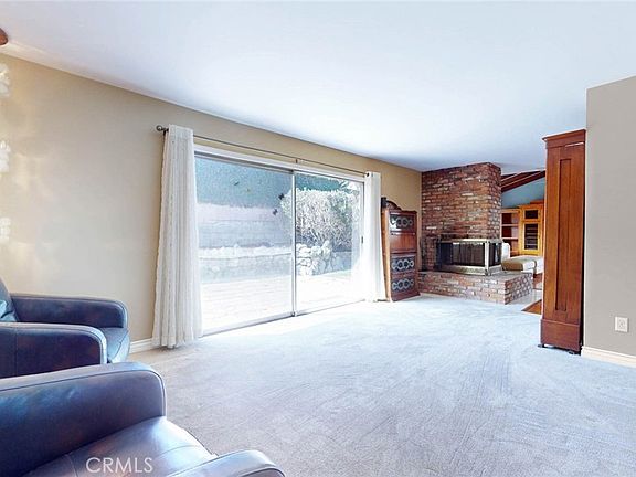 The updated kitchen, featuring modern finishes, seamlessly opens to the dining area and a large family room. The family room is highlighted by a two-sided fireplace and vaulted wood beam ceilings, adding a touch of warmth and character. The sunlit living room, with sliding doors that lead to the backyard, offers the perfect indoor-outdoor flow.