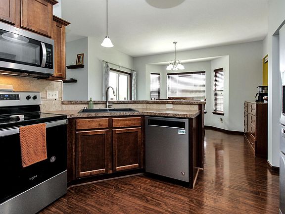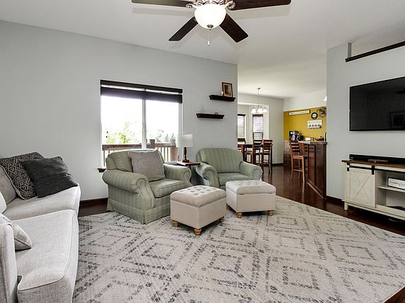 Welcome home to this beautifully maintained 5 bedroom. 3 bath ranch in Maize. Professional photographs to come. This home is the definition of turnkey. The main floor features beautiful, high-quality wood laminate flooring throughout the common living space and primary bedroom. The split floor plan offers three main-level bedrooms with the primary suite featuring a balcony/deck, trayed ceiling, walk-in closet and private bathroom with heated tile floor. The kitchen features an eating bar, walk-in pantry and beautiful view of the neighborhood pond. This home is perfect for enjoying the outdoors. You'll love lounging lakeside on the covered deck or the new cement patio. The basement has been finished to include two bedrooms with walk-in closets, a full bath with heated floors and a large family room perfect for entertaining or relaxing for a movie night. The owners have added a custom-built entertainment area with projector. The space will accommodate screens up to 85" and the projector remains with the home. If that isn't enough, there is also a recently completed wet bar with concrete countertop and subway tile. The basement also features a linen closet, utility room and separate storage room. The home includes a radon mitigation system, water softener, whole-house water filtration system - all of which are owned and will remain. The interior was freshly painted in 2023. Garage is insulated and drywalled. Kitchen refrigerator and wine fridge do not remain.