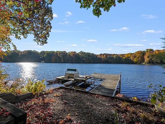 Secluded and serene 4.4-acre retreat with 700 ft of frontage and private dock on peaceful Canterbury Lake. This charming home features natural wood walls, trim, and ceilings throughout. The inviting living room boasts a cathedral ceiling, cozy gas fireplace, and stunning lake views. Kitchen includes range and refrigerator. Main floor primary bedroom offers a beamed ceiling, while the full bath features a classic clawfoot tub. Main floor laundry with washer and dryer included. Upstairs are two loft-style bedrooms. Enjoy a 24x40 garage with attached workshop. Canterbury Lake is a no-wake, 20-acre lake ideal for fishing, swimming, kayaking, and paddle boarding. Wander wooded trails and enjoy tranquil views of the lake in this one-of-a-kind nature retreat (acreage per plat map)
