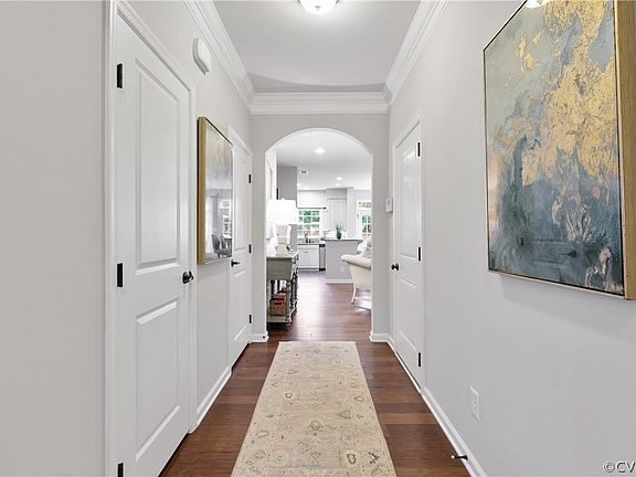 Welcome to beautifully landscaped Hunton Park minutes from Short Pump area. This home features three bedrooms, two and a half bathrooms, a front-load garage & concrete patio. Freshly painted interior and new carpet upstairs. Hardwood graces the entire first level. The foyer is spacious and elegant with crown molding. The spacious great room boasts a gas fireplace with stone hearth and recess lights. The gourmet kitchen sparkles with granite counter-tops, SS appliances including refrigerator, smooth top stove oven, dishwasher, and built-in microwave. The spacious dinette has a tall double window with transom as does the backdoor. Six recess lights and an upgraded chandelier over the dinette provide excellent nighttime illumination. Elegant backsplash compliments the kitchen colors nicely. Upstairs, the primary suite is spacious and bright with an upgraded lighted ceiling fan and four recess lights plus tall windows. The walk-in closet is very roomy. The primary bath has double vanity with quartz counter-tops and cabinetry, mirror and upgraded light fixtures. The shower has tile backsplash that matches the floor and a built-in seat. There’s also a linen closet and a window. Down the hall, the second full bath and laundry are conveniently located to serve bedrooms two and three. Don’t miss this great value! ***New AC unit!