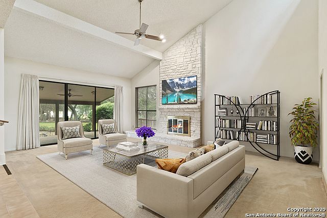 Make this house your home! This meticulously maintained property boasts beautiful architecture, sky high ceilings, a unique and open single story floorplan with fantastic flow, a floor to ceiling stone fireplace, exposed brick in the master bedroom, windows galore offering tons of natural light, awesome views from almost every room of your landscaped .43 acre lot featuring mature oak trees, a greenbelt and spacious outdoor living space! Enjoy your private piece of paradise in the heart of Elm Creek!