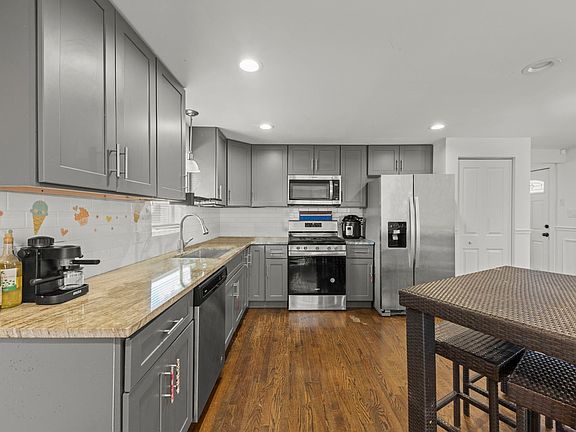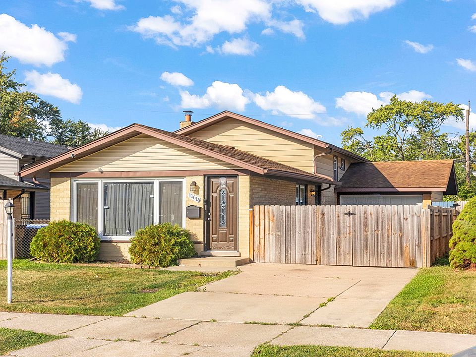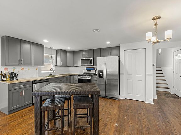 Beautifully updated brick split-level offering 3 bedrooms and 2 full baths! Step inside to find gleaming hardwood floors throughout the main and upper levels, complemented by a custom hardwood staircase. The stunning eat-in kitchen features modern gray shaker cabinetry, granite countertops, stainless steel appliances including a 5-burner range, refrigerator, dishwasher, and built-in microwave. Both bathrooms have been completely renovated with eye-catching tilework, a whirlpool tub, and a separate walk-in shower. The finished lower level provides additional living space with a spacious family room, full bath, and laundry area, perfect for relaxing or entertaining. Outside, enjoy a huge fenced backyard ideal for gatherings or play, along with a concrete side drive that leads to the attached garage. This home combines modern style, quality finishes, and a functional layout, all ready for its next owner to move right in!