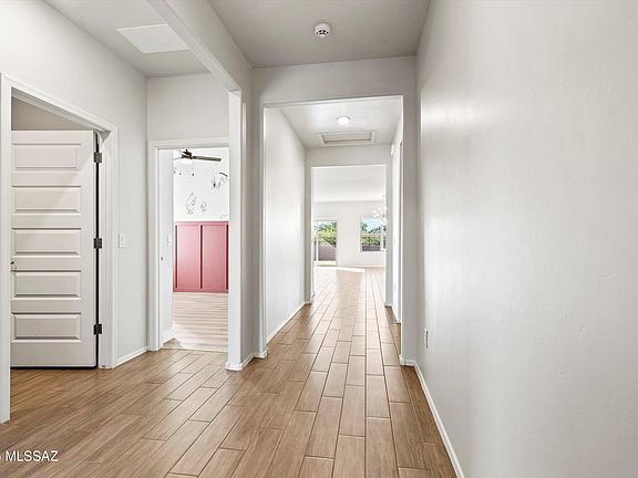 Welcome to this beautifully maintained Move In Ready 2020 D. R. Horton home, featuring three bedrooms and two bathrooms. Step inside and admire the upgraded tile plank flooring, oversized baseboards, and light-filtering roller shades that adorn the double-hung windows. The heart of this home is the great room kitchen area, boasting a stunning granite slab island and counters, a double stainless sink, a wine cooler beverage center, and a gas range that will delight any chef. The split bedroom plan ensures privacy, with the expansive primary suite offering two generous closets and a double sink vanity. Step outside to the covered patio and take in the breathtaking mountain views. The outdoor space is designed for relaxation and entertainment, featuring artificial turf, decorative gravel, and a paver area with no rear neighbors to interrupt your tranquility. The two-stall garage includes epoxy flooring, a tankless water heater, and ample storage space. Conveniently located near the Marana Aquatic & Rec Center, with easy access to I-10, restaurants, and shopping, this home has everything you need for a comfortable and stylish lifestyle.