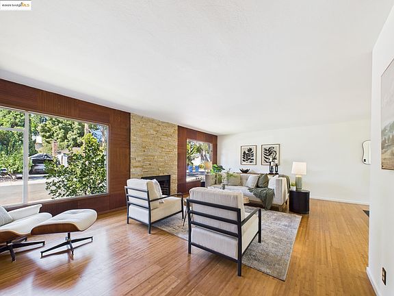 This 4-bedroom, 2.5-bath mid-century modern ranch offers 1,837 sq ft of stylish single-level living on a 5,500 sq ft lot. The living room showcases rich built-in shelving, wood paneling, and a stone fireplace, with expansive windows overlooking the backyard. Walls of glass in the dining area frame lush gardens, while the kitchen pairs tiled counters, a skylight, and island seating with a unique tile floor. The primary suite features parquet floors, a walk-in and second closet, and tastefully updated bathroom. Built-in dressers in the back bedroom and hall highlight the home’s thoughtful storage. Outdoors, a private courtyard with brick planters is perfect for entertaining, a bougainvillea-draped patio makes an intimate retreat, and the side yard’s towering shade trees and open mulched space invite relaxation or play. An oversized one-car garage adds versatility for storage, hobbies, or a workshop. Set on a peaceful cul-de-sac near San Leandro’s shops, parks, and BART, this timeless home blends classic mid-century character with everyday comfort.