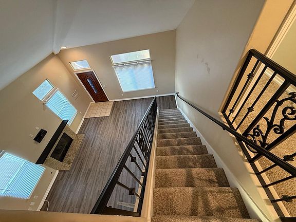 This two-story home features a bright and open floor plan with vinyl plank flooring on the main level and carpet upstairs. The updated kitchen is equipped with quartz countertops, stainless steel appliances, and plenty of cabinet space. All three bedrooms are located upstairs, including a large primary suite with balcony and en-suite bathroom.