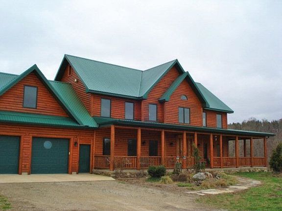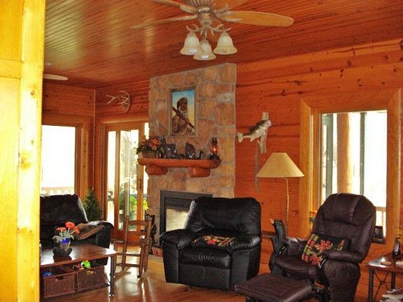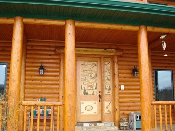 Elite 2-story log-sided home on crested 5 ac of NorthFork Village. 5200+ sqft includes 4B & 4Bth, 2 kitchens, library, office, several sitting rms, living & family rooms, indoor and outdoor dining areas, sunroom, full wlkout bsmnt, attch 2 car garage and a detach 2 car garage w/ upper level guest quarters. SS Sub-Zero fridge and gas range, hand carved wooden murals, multiple fireplaces, wraparound porch, multi-level decks, river access and view.