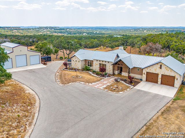 Outstanding Hill Country property that impresses you from the moment you drive up the long, winding, paved driveway leading to a unique elevated homesite with astonishing views in every direction! This incredible 25.6 +/- ac property has it all w/mature trees, fenced lower horse pasture/hay meadow, seasonal creek & wildlife exemption! Enjoy the private setting as well as the recreational opportunities including shooting a firearm & hunting. Large metal 3 bay equipment barn w/private back patio as well as additional wooden barn in meadow. Relax on your covered back patio & appreciate the view of the beautiful in-ground Gary pool & spacious outdoor kitchen that makes any gathering memorable. This is an opportunity of a lifetime to own a homestead that is heads above the rest. The well-built, meticulously maintained custom home stands out above them all w/it's excellent exterior appeal & attention to detail inside! The 1890's barn wood from Iowa enhances the rustic charm throughout. Incredible custom, handmade stone wood burning fireplace w/gas starter & logs, a chef's dream island kitchen w/commercial grade Sub Zero refrigerator, Wolf gas range w/griddle, wine fridge & walk in pantry! Luxurious owner's retreat w/outside access, multiple closets, separate shower & Air tub. Beautiful 9-foot Alderwood doors, double insulated Pella windows & exterior doors. Solid 2x6 exterior framing construction w/foam insulation in interior walls. Oversized garage featuring a man cave tucked away from the rest of the home. Quiet peaceful days that feel far away from the city yet offering an easy commute to Austin, San Antonio & San Marcos & a stone's throw away from Canyon Lake & Blanco.