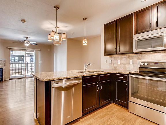 PRICE IMPROVEMENT! Beautiful first floor, 1 bedroom plus office/den condo in a secure building! New carpet and paint. Stainless appliances. Full size stackable washer and dryer included. Gas fireplace. Enjoy and relax on your private balcony with mountain views for your morning coffee and evening wine. Steps away from Town Center. Quiet. Access to Highlands Ranch recreation centers with so many amenities. Reserved parking space right outside the building. Storage area in parking garage. Short distance to RTD and E470 means easy access to the mountains and downtown. Many trails and parks nearby.