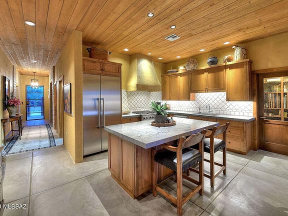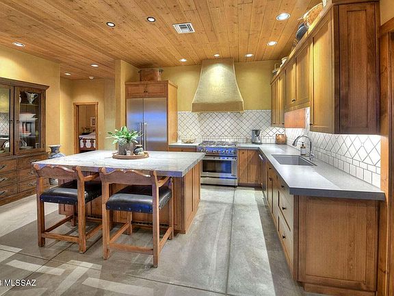 Stunning Stellar Gray built home in the gated SkyRanch community. Unmatched construction and design pair with gorgeous Catalina mountain views and private open space to create a uniquely impressive home. Featuring Rasta Block (ICF) construction, steel roof and polished concrete floors. Inside the elegance of hand plastered walls, cedar planked ceilings, Metropolitan quartz counters and quartzite kitchen island, Thermador and DCS appliances, authentic antique doors at Primary bedroom and Office will leave you in awe! Outdoors you'll find the perfect space for relaxing or entertaining from the beautifully landscaped backyard and patio with raised firepit, mountain views and lots of privacy. A true southwestern beauty!
