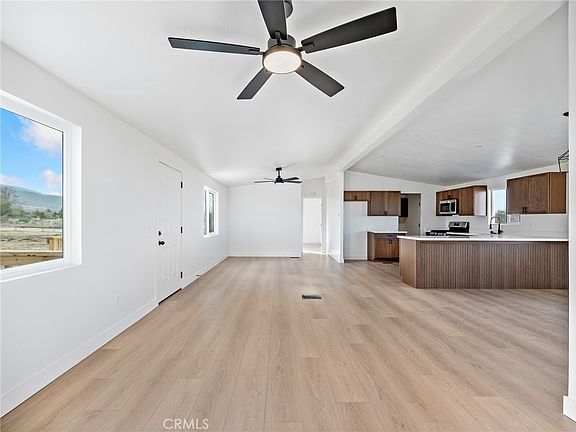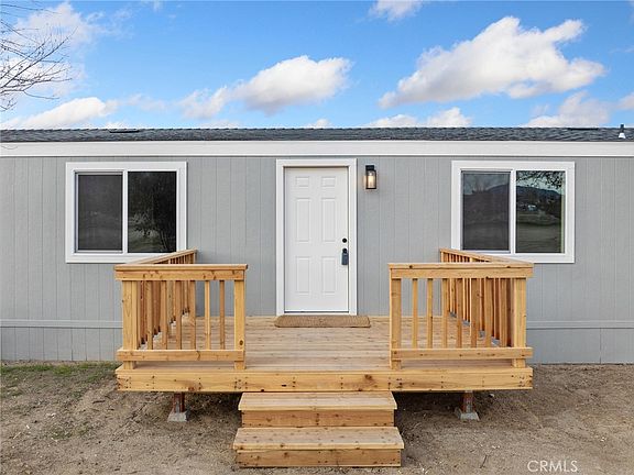Newly remodeled and renovated from top to bottom! This manufactured home feels brand new and has a split floor plan that provides a 4 bedroom and 2 bath home on a spacious 2.2 acre property that is fully fenced and offers 1,584 +/- square feet for the entire family. The outside of the home has been updated with all new exterior siding, new paint, new wood front porch and back step, new windows and a brand new roof. The inside of the home has also been completely renovated with new flooring throughout with luxury vinyl in most of the home and carpet in the bedrooms, brand new kitchen with modern wood cabinets and white quartz counters, and stainless steel appliances. Additionally, the bathrooms have been updated with new white shaker vanities with matching quartz counters, new tiled bathtub enclosures and new electrical and plumbing fixtures. The floor plan was opened up and greets you with an enormous great room that has an expanded kitchen with plenty of cabinet and countertop space as well as a long breakfast bar counter. Additionally this great room has a separate dining area and a long living room space perfect for entertaining. The laundry room has traditional overhead cabinets above where the washer and dryer would go, but also has a separate set of cabinets with quartz counters for storage and folding space. This home also has a brand new heating unit and AC condenser installed for central heat and air. Outside the entire property is fully fenced with the front portion (along Desert View Rd) being newly installed 5 foot chainlink with top rail that has a traditional 16 foot drive through gate as well as a walkthrough gate next to it. The property was recently cleaned and provides an enormous amount of space for parking, building a detached garage, adding storage sheds, or animal facilities. The location provides quick access to Hwy 138 to commute or drive to town and schools. The property is zoned for horses and located within the Snow Line School District.