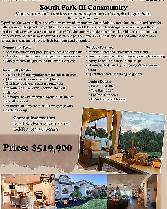 In the heart of South Fork III, this beautifully maintained 2018 home offers the perfect blend of space, warmth, and modern comfort. With 3 bedrooms, 2.5 baths, and a flexible bonus room, it is designed for both relaxation and everyday living. The open floor plan flows through tile-lined spaces into a bright living area where a three-panel pocket sliding door opens fully to an extended screened lanai. Evening light fills the home as sunsets paint the sky, creating a calm and inviting atmosphere.