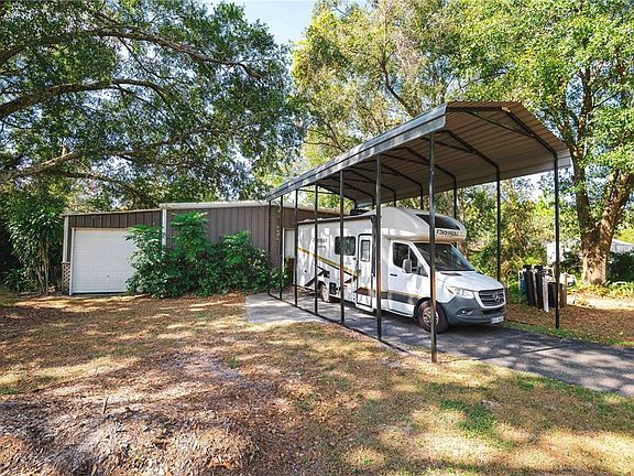 Imagine living minutes from Westchase, yet surrounded by peaceful space, privacy, and freedom. 11626 Timber Ridge Drive in Tampa is a rare property on 0.53 acres, where suburban convenience meets country charm, offering both residential comfort and functional workspace. With no HOA, this home provides exceptional flexibility in a semi-rural setting where you might even see a horse stroll by from nearby equestrian properties. Previously a primary residence and more recently an investment property, it has been meticulously maintained and thoughtfully upgraded. Major improvements include a new roof (2020), new electrical panel (2020), metal fence and automated gate with two remotes (2021), and a new RV carport (2024), while the interior remodel (2020) gives the home a modern, move-in-ready appeal. Thoughtfully designed for both comfort and practicality, the property includes covered parking underneath the home for added protection, a storage room with an extra refrigerator, and a vertical platform lift that offers step-free access to the main living area. Enjoy easy outdoor access from both the front and rear balconies, ideal for morning coffee or evening relaxation. Inside, the kitchen features a reverse osmosis filtration system, and the property is equipped with a comprehensive home security system with cameras for added peace of mind. In the rear of the lot sits a 30'x30' metal garage equipped with a 50-amp plug for an EV or RV and a working air-compressor hose. Inside the garage, there is all new electrical/lighting and artificial turf installed over a concrete pad. It was previously used as a sports-training facility, which demonstrates the versatile space for recreation, storage, or business use, while an attached side storage unit adds even more functionality. This distinctive property is perfect for anyone seeking a home that blends comfort and versatility. It's a space that accommodates modern living, hobbies, and entrepreneurial pursuits, all in one unique and well-maintained package.