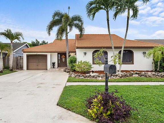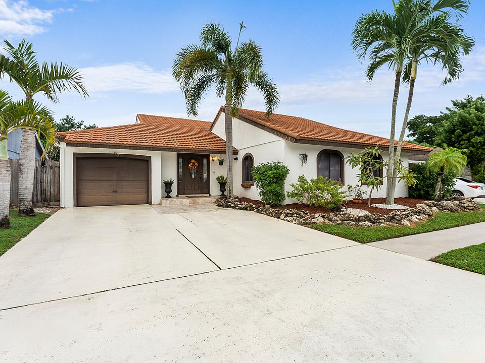 Welcome to your private oasis in West Boca! This stunning home features a courtyard-style patio with a heated kidney-shaped pool and spa, enhanced by new Diamond Brite finishing and LED lighting. The barrel-style metal roof adds durability and style. Inside, enjoy vaulted ceilings with tongue and groove pine wood and matching six-panel doors. The upgraded kitchen boasts granite countertops and crown molding.Just 2 mins from the 3800 acre county park, South County Regional. Walking distance to nearby schools.Recent upgrades include a new sprinkler system, pool pump, AC unit, and repaved travertine backyard. The remodeled guest bathroom and dimmable smart lights throughout enhance comfort and ambiance. Experience luxury and privacy in this sought-after neighborhood. Don't miss out