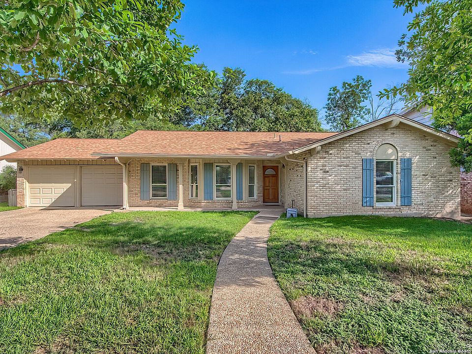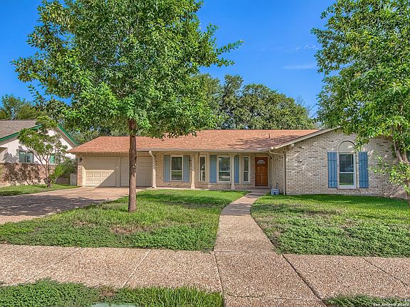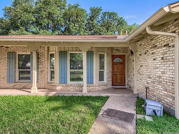 ELEGANT, FOUR BEDROOM, SINGLE-STORY RANCHER IN ENCHANTED FOREST WOWS WITH MODERN UPDATES, OPEN FLOOR PLAN AND GORGEOUS YARD! This proud grand dame was the model home way back in the 60s and that quality still resonates as you are welcomed home. Just off San Pedro north of 410, just outside Castle Hills, Enchanted Forest is a hidden enclave of estate lots and tree-lined streets. Pull up to a four sides brick beauty who beckons you from a quiet cul-de-sac. Move past a charming front porch and into a wide open living space awash with natural light. Gleaming luxury vinyl floors stretch into the dining space and huge, renovated kitchen. Here find everything you could want in a cooking/gathering space -- one so extensive you'd expect to find it in a luxury home. You'll find sleek granite countertops, glass tile backsplash, an 8x4 foot eat-at island, new 42-inch white shaker cabinetry with modern hardware, a separate space for a coffee bar and even a huge 6x4 foot picture window over the deep sink that shows a view of the tremendous, lush and shaded backyard. A fireplace with long hearth on the wall of the dining/den space sets a cozy atmosphere to the open concept renovation. Tucked behind the kitchen find an extra generous laundry room with tons of storage that takes up the entire back wall and access to the backyard as well as the attached two-car garage. The two-door garage not only offers room for vehicles and pegboard wall for tools but also a dedicated workshop with door to keep all your projects neatly stored out of sight. Back inside, head down the hallway to a guest bath renovated with new higher vanity and mirror, new toilet and a tub/shower combo. Three secondary bedrooms reveal the character of this gracious gal with original wood parquet floors refinished to match the gray theme of the home. The primary suite is a true retreat with a walk-in closet sometimes hard to find in this era of build and ensuite bath fully renovated with high solid surface vanity, glamorous mirror and a glass door walk-in shower with subway tile and convenient shampoo shelf inserts. Pop outside from the smooth opening Pella sliding glass door to your covered patio with pebble floor offering a view of your private backyard, behind a privacy fence, under towering oak trees and landscaped with St. Augustine, iron plants and other perennials where the model home's landscaping has had six decades to mature. Flagstone pavers extend the patio space for seating under the shade. A storage shed is tucked off to the side, nearly out of sight and easy to access for mowers and gardening tools. Add up all the extras in this home and know you are making the right decision -- 30-year architectural shingle roof with ridge vent, gutters, new windows, fresh paint, new bathrooms, kitchen and LPV and wood floors. Now consider the incredible convenience being 5 minutes to the airport, a few blocks off 281 for 10 minute access to the Pearl, 15 minutes to downtown/Riverwalk and easy commutes to all the military bases and you won't be able to say anything but yes to this house!