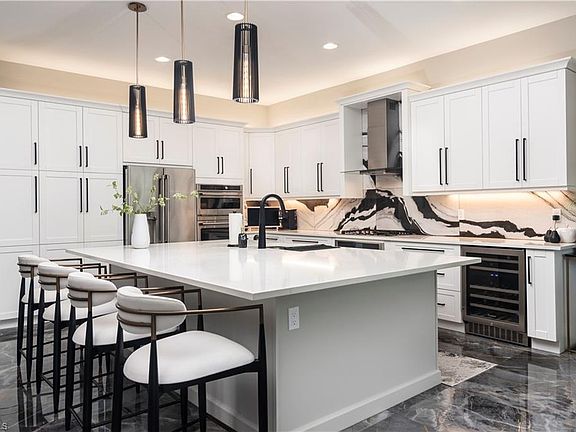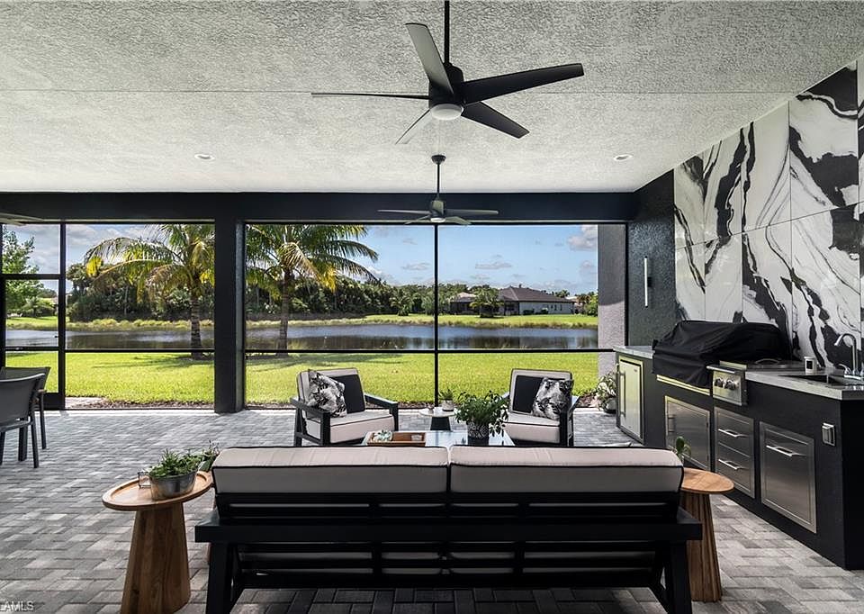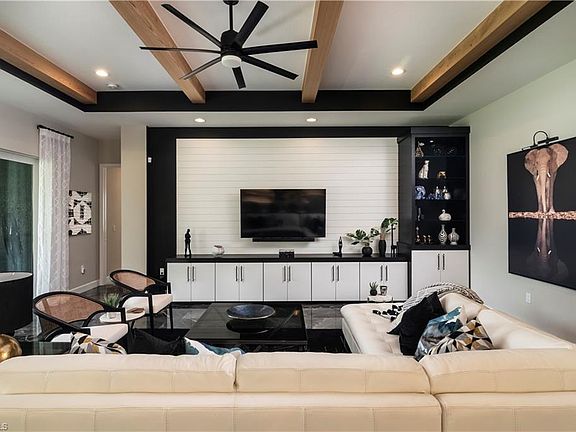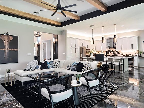 Stop and view the most beautiful Sunrise Home for sale in Valencia Trails - and it's the desired Southern Exposure! From the gorgeous oversized and private lake front lot to the stunning interior features and design - you will not be disappointed! Be ready to Move right in. Every possible upgrade and design feature has been tastefully incorporated in the home. Look at the photos and you will fall in love. Walk into the 14-foot-high foyer with custom designed wall treatment and wood beams and wagon wheel chandeliers and follow into the open concept kitchen and living area where you will find 24 x 48 Porcelain tile flooring for a luxury look. The chef's kitchen has been remodeled to add all upgraded GE Cafe appliances and an additional double wall oven and built-in wine cooler . Cooking is with Gas! Upgraded White Cabinetry with roll out pantry drawers and custom hardware. Backsplash is a spectacular showstopper in black and white marble, and the outdoor kitchen matches this perfectly. The huge kitchen island is the heart of the kitchen. The great room has built-in cabinetry to match and Custom wood ceiling beams to top off the design. All the rooms have designer drapes, valances, and silhouette shades. Walking through the rest of this beautiful home you will find the same custom built-ins, designer window treatments, lighting fixtures and accent walls and ceilings. The three-car garage has additional shelving and epoxy flooring. You will see that no detail has been spared. When you walk out to the oversized rear screened patio you will find a full kitchen for cooking and barbecuing for your next party as well as comfortable lounging and dining areas. The lot is large enough to add a private swimming pool and spa. And what a peaceful and private view! Don't miss out on this beautiful home. This home is a must see! Valencia Trails is the pinnacle of 55+ living. This beautifully landscaped community features World Class Amenities which include; Wide Walking and Biking Paths, a Dog Park, Many Pickle Ball and Tennis Courts, a beautifully appointed 43,000 square foot Clubhouse with a Full Service Restaurant and Bar, Resort Style Pools, Fitness Center, Spa and Beauty Salon, Craft and Card Rooms, a Theater Room which hosts Fabulous Concerts and Shows, and too many clubs and classes to mention! Come and explore this vibrant, active community today