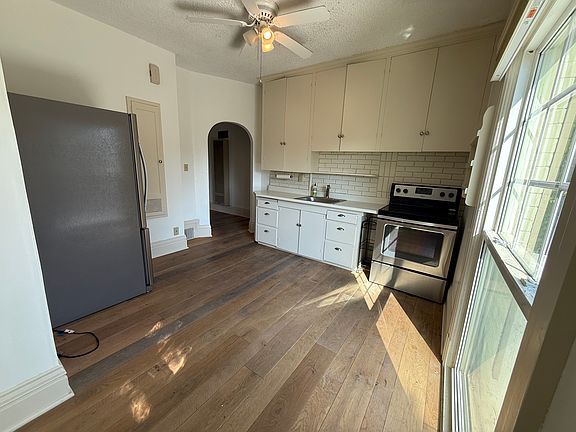 This upper level unit will knock your socks off. The space offers private entry from the front porch with additional storage. As you enter the space you are greeted by new hardwood floors which flow throughout the unit. The space is illuminated by plenty of natural light provide by large south and west facing windows. The many built-ins offer convenience and comfort for your personal items. The large kitchen is graced with newer stainless steel appliances and plenty of counter space with an additional eating area. The full remodeled bathroom is finished with timeless subway title and contemporary vanity. The building offers ample parking with one covered parking space. This space is available now.