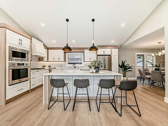 Welcome to this beautifully renovated and restyled 1365 sq ft bungalow. A new south facing front porch greets you as you walk up the new pathway. AS you enter you will be impressed with the new vaulted ceiling great room complete with feature electric fireplace, open to the 2 toned kitchen cabinetry, gas cooktop and custom hood fan, eat up island with waterfall quartz and enough room for 4 chairs. Dining area has more built in cabintry and garden doors with great access to your backyard and garage. There are 2 bedrooms on the main, Primary with walk in closet and 4 pc ensuite. Just off the mudroom are the stairs to the lower level , your family room with another electric fireplace, wet bar and 2 further bedrooms. There is also a flex room/office area that can be closed off with the french doors. All new mechanicals, electrical panel, new furnace, hotwater tank 2025. Double detached garage has new expoxy floor, new overhead door too.