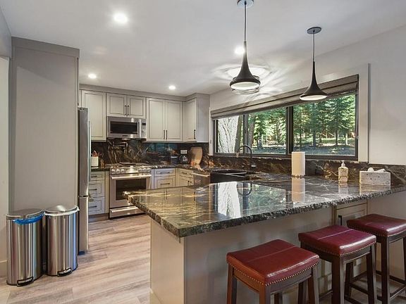 * Luxury Tahoe Vista Mountain Retreat * Centrally located between Northstar and Lake Tahoe, this newly renovated four-bedroom, three-and-a-half-bath luxury home combines modern design with mountain charm. The open-concept layout features a warm living room with fireplace and a chef’s kitchen showcasing live-edge granite countertops, high-end LG stainless steel appliances, custom cabinetry, a wine fridge, and expansive windows that flood the space with natural light. Cali Click-Lock vinyl flooring runs throughout the home, creating a seamless and stylish flow. Two of the bedrooms are ensuite, with bathrooms boasting custom modern fixtures, granite vanities, and oversized walk-in showers. All bathrooms have been fully remodeled with new tile, showers, tubs, and fixtures, while the master bath offers the added comfort of heated floors for chilly winter mornings. Nearly all windows have been replaced with custom Anderson windows, complemented by Hunter Douglas top-down, bottom-up window coverings and blackout blinds in the master and fourth bedroom. Custom doors, trim, lighting, and fresh professional paint inside and out complete the home’s updated aesthetic. Step outside to a private rear deck with a spa overlooking a serene, forested yard—perfect for relaxing or entertaining. The property is being sold turnkey and fully furnished, including décor, furniture, and beds/mattresses that are approximately two years old, making it completely move-in or rental ready.